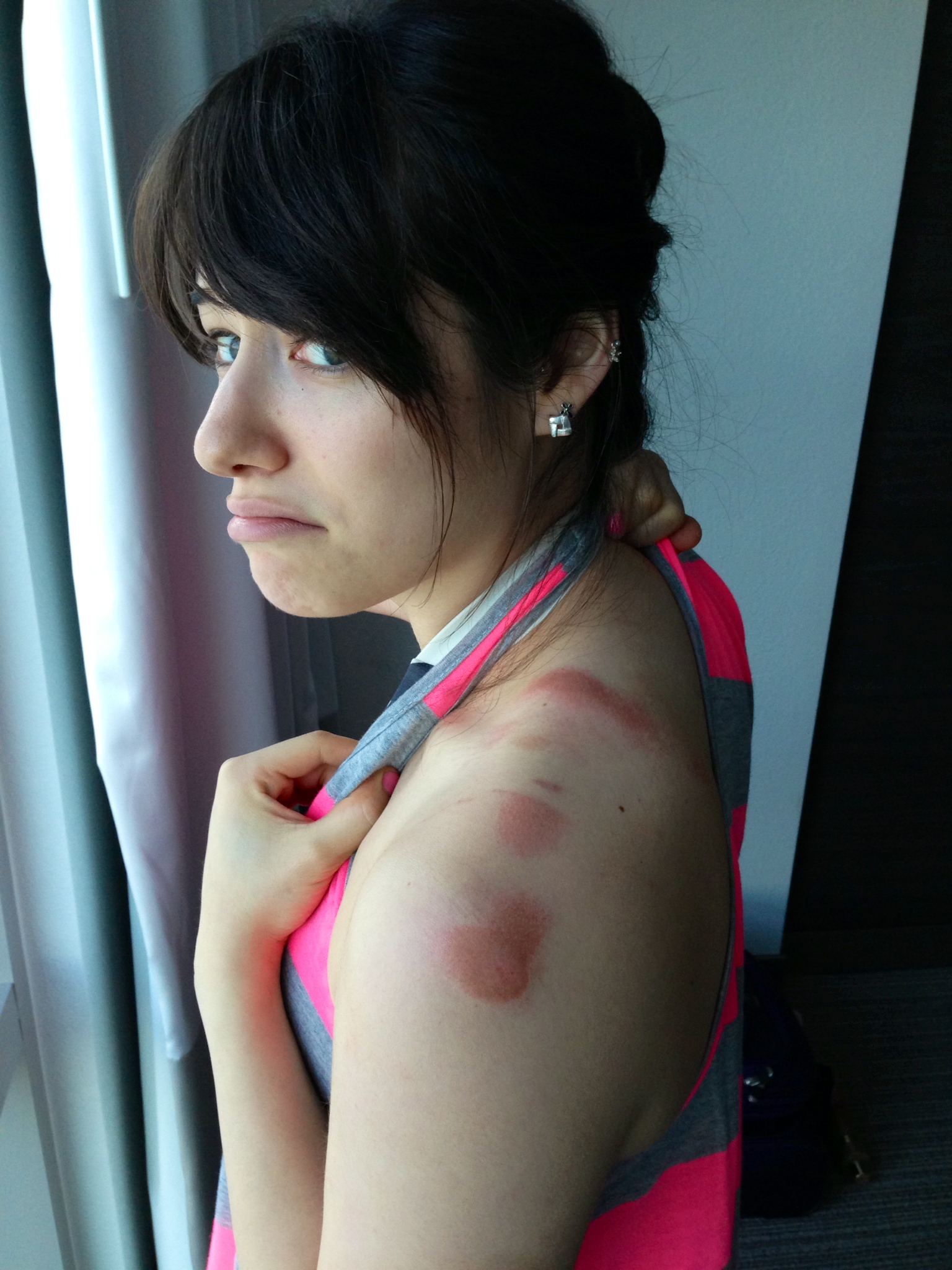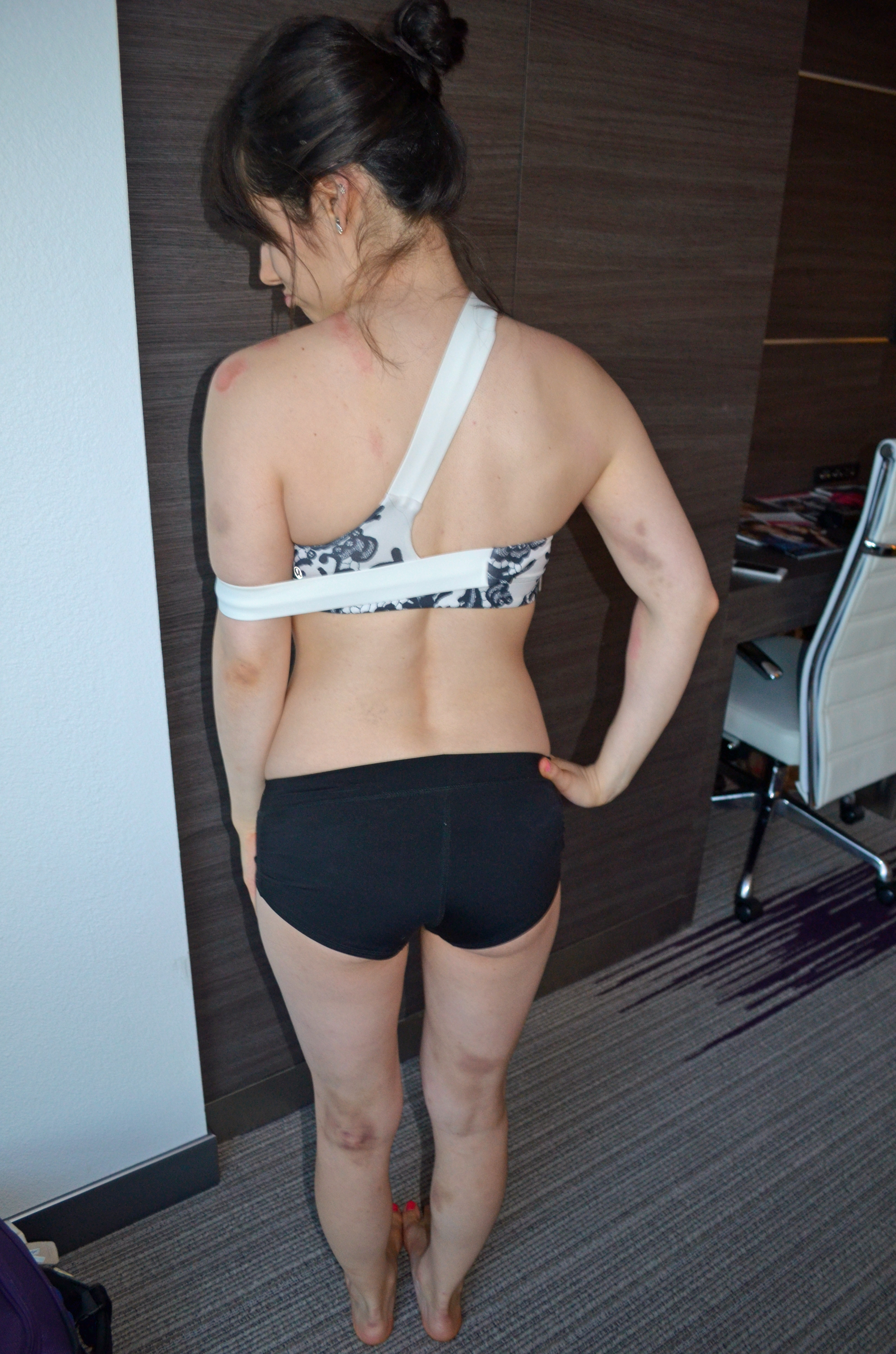 Chinese pole was a toughie. I wasn’t expecting it to be that different from regular pole, but I was so wrong! For those of you that don’t know, Chinese poles are coated with a silicone/rubber material and you have to wear long pants and a long sleeve shirt to minimize burns. Shoes are typically worn as well to help with climbing the pole. Unfortunately, I forgot my sneakers so I ended up doing the workshop in ballet flats, which made it more difficult. In the beginning we worked on different types of Chinese pole climbs. It was so weird using the soles of my feet to climb the pole – it was hard to shake off the initial “point your toes!” mantra that I’m constantly drilling in my brain. For the rest of the workshop I concentrated on fonjis – regular and reverse as well as stringing them together. I actually found the fonji to be somewhat more difficult on the Chinese pole since my shoulder kept sticking to the pole. I think I attempted the fonji-reverse fonji combo too much because I left the workshop with terrible burns – through my long-sleeved shirt!