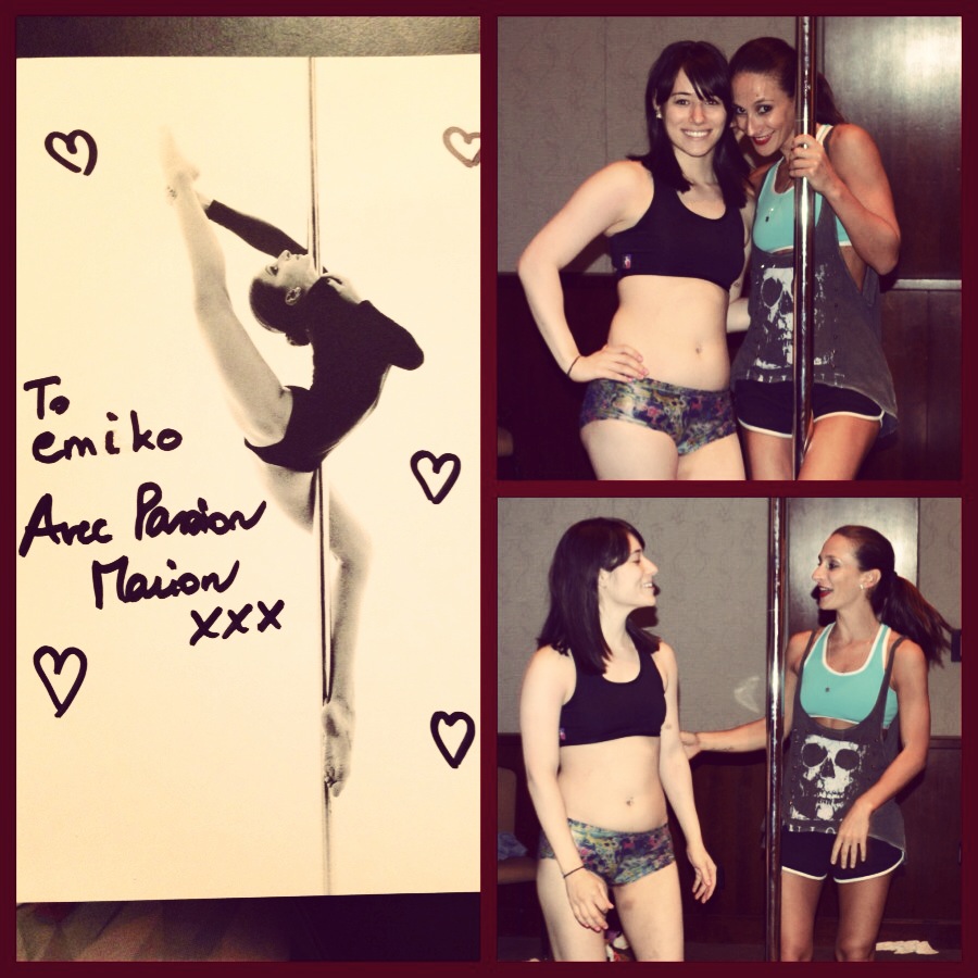 I absolutely loved this workshop. Taking a non-pole class after 6 pole workshops in 2 days felt like a breath of fresh air and Marion really stretched out our muscles nicely. After warming up with some dynamic stretching, Marion had us focus on hip flexors, shoulders, neck and back. One of the most important lessons I took away from this workshop is to NEVER stretch for middle oversplits by putting blocks under your feet. Marion explained that this can cause the knees to become hyper flexible, which compromises the stability of your knees making them more prone to injury. She said that the proper way to stretch for middle oversplits is to either put blocks under the knees or to arch your back as you sit in your middle splits. I also found out that neck flexibility plays an important role in back-bending poses (which makes sense now) and Marion told me that I have very flexible neck! She also stretched my shoulders when she was showing everyone how to partner stretch and asked me if my flexibility was natural or if I worked for it. When I told her natural, she kindly reminded me not to forget the importance of strengthening – naturally flexy people need to make sure their muscles are strong enough to support them in these positions! Thank you Marion π By the end of the workshop my muscles were so warm and stretchy. I hope I get to take another contortion session with Marion one day!